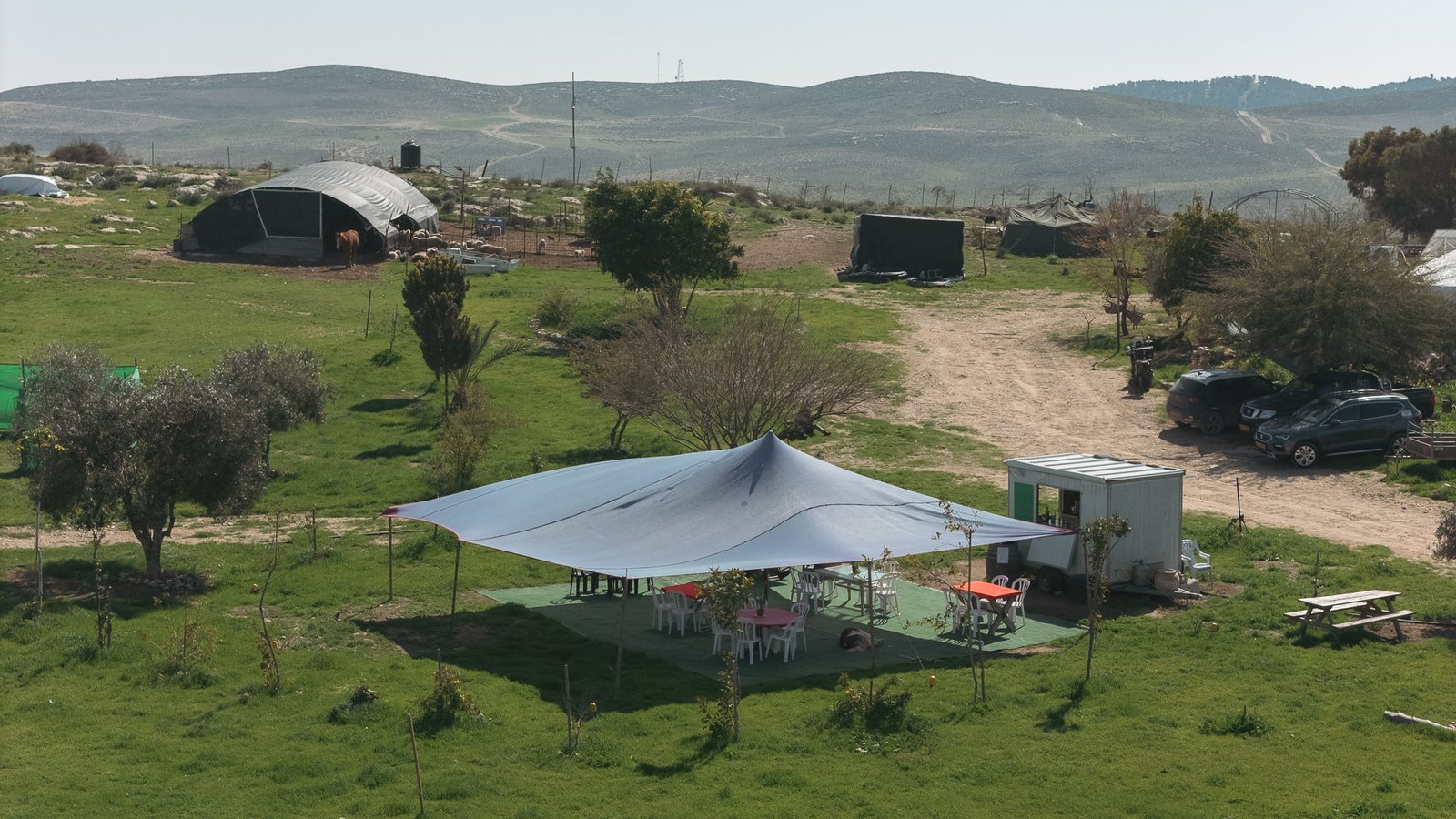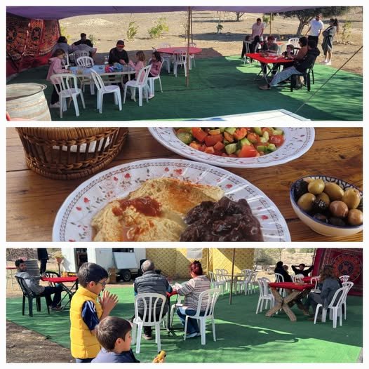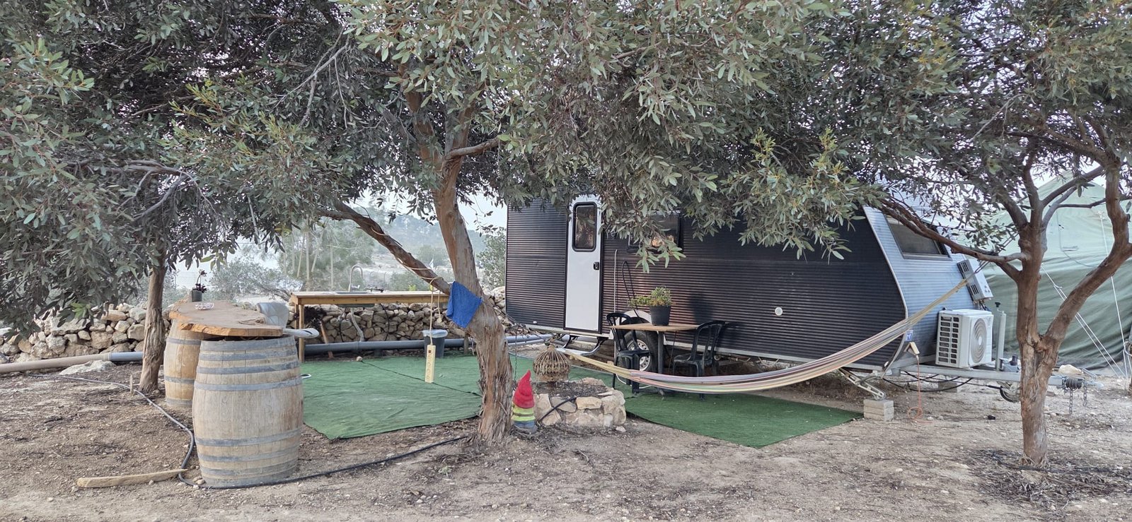 האירוח כולל לינה בקארוון הצופה אל נוף פתוח, אוהל מרכזי נוח לפעילויות משותפות, ואפשרות לקמפינג באוויר הפתוח — בפשטות נעימה ועם תחושת חופש אמיתית.